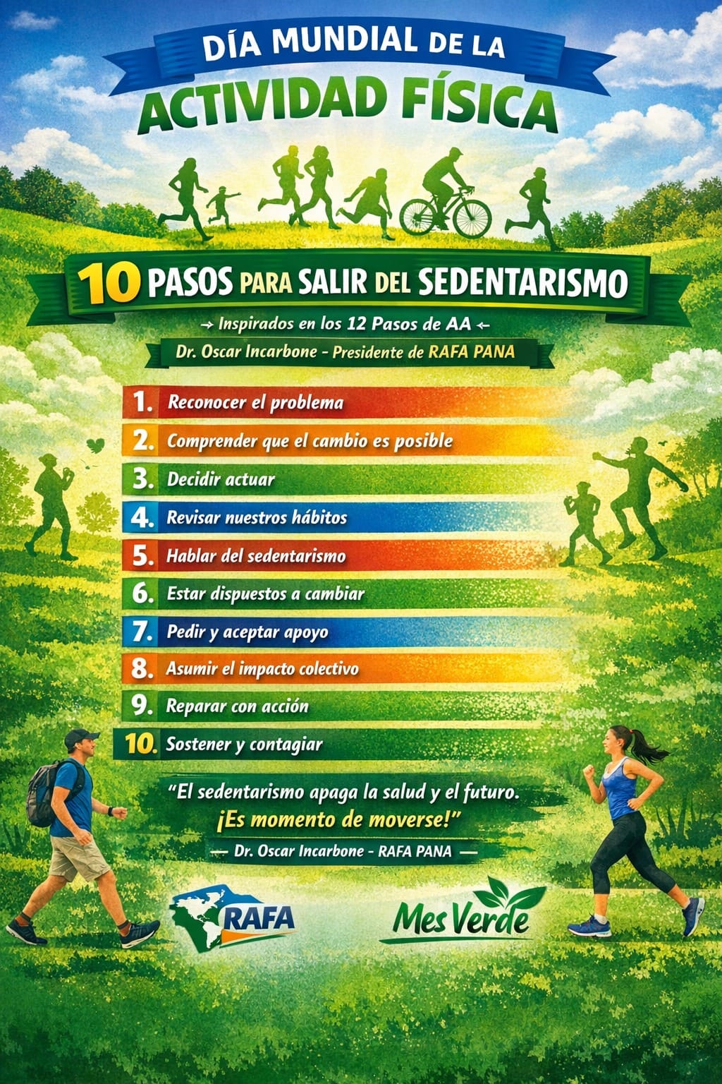 Así como otras problemáticas complejas han encontrado caminos colectivos de transformación, desde RAFA-PANA y sus instituciones socias, proponemos estos 10 pasos para salir del sedentarismo, inspirados en el enfoque de los 12 Pasos de Alcohólicos Anónimos (AA), adaptados al campo de la promoción de la salud y el movimiento humano.