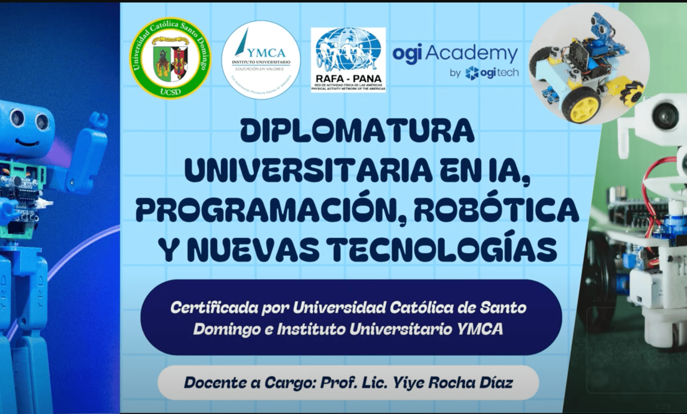 Diplomatura Universitaria en IA, Programación, Robótica y Nuevas Tecnologías. Certificada por la Universidad Católica de Santo Domingo y Instituto Universitario YMCA. La cursada inicia en junio de 2025