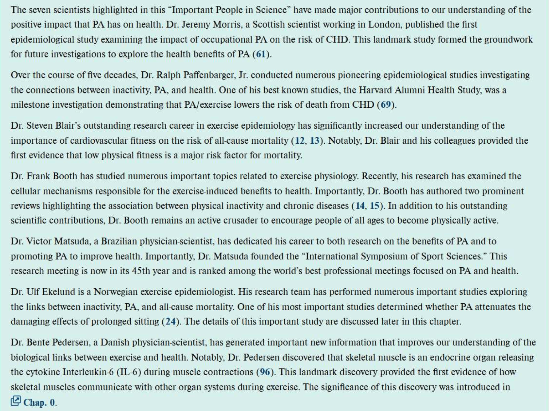 Recientemente me enteré de que el Dr. Victor recibió un merecido reconocimiento. En la 12.ª edición del clásico libro de texto de Fisiología del Ejercicio de Scott Powers, publicado en 2023, en el capítulo sobre actividad física y salud, se cita al Dr. Victor en la página titulada «PERSONAS IMPORTANTES EN LA CIENCIA», junto a nada menos que J. Morris y R. Paffenbarger, entre otros. Este reconocimiento reconoce el papel irremplazable de nuestro querido Dr. Victor en la investigación y la intervención en AF y Salud. Vea el texto debajo de las fotos, que, además de reconocer el papel del Dr. Victor, también cita a nuestro querido Simposio como uno de los mejores eventos de AF y Salud del mundo. Me siento muy orgulloso como amigo, brasileño y profesional en el campo. Este es un reconocimiento bien merecido, proveniente de una fuente muy respetada. Celebremos con el Dr. Victor.