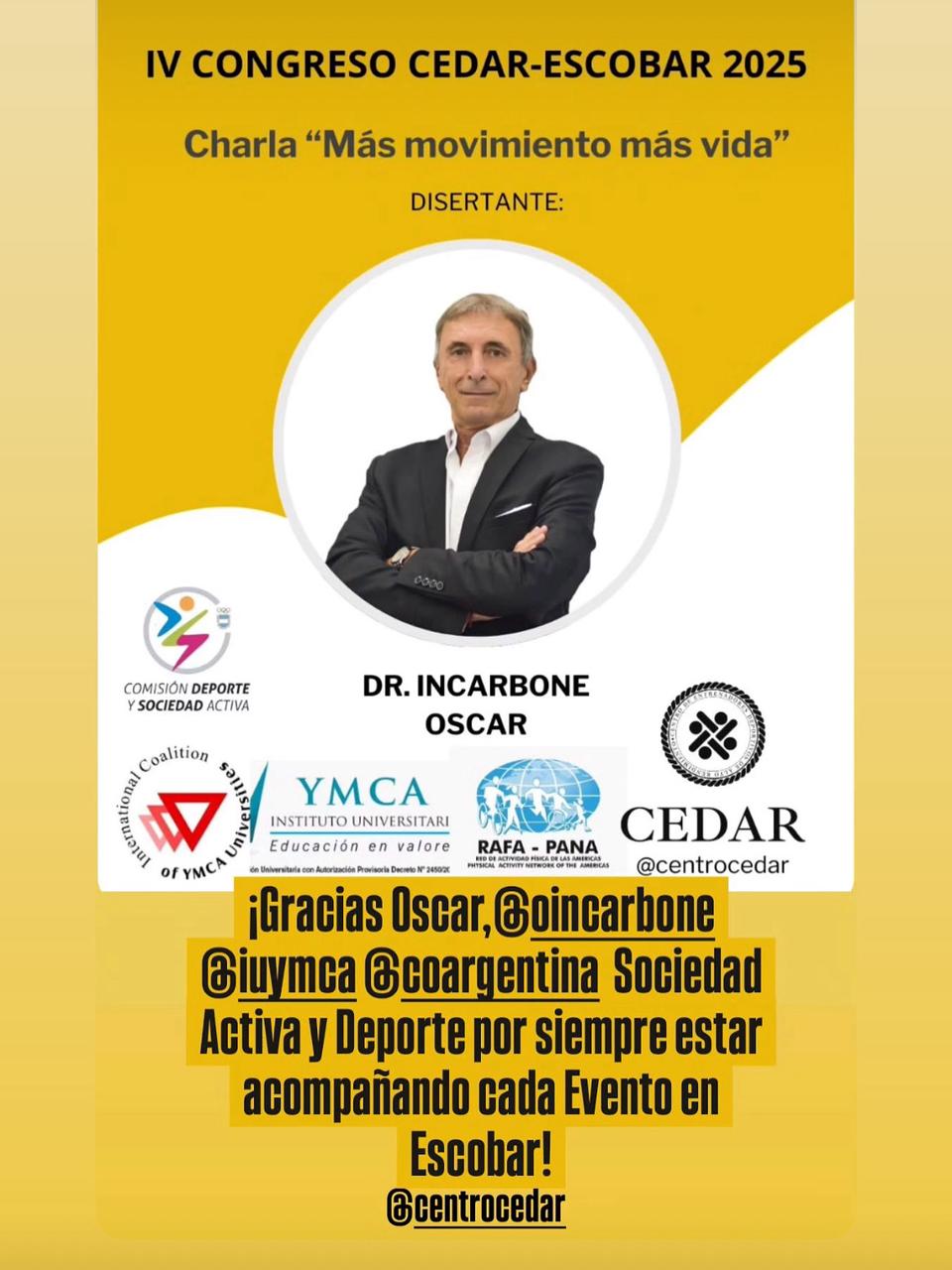 IV Congreso CEDAR-ESCOBAR 2025Charla "Mas movimiento más vida" disertante Dr. Oscar Incarbone 27/08/2025Geral, Notícias Compartilhe: