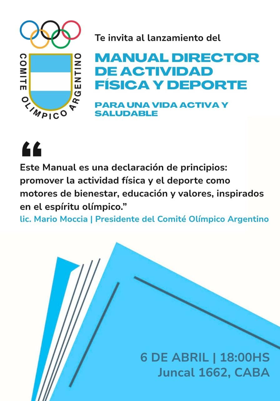 Comité Olímpico Argentino te invita al lanzamiento del Manual Director de Actividad Física y Deporte para una vida activa y saludable. 6 de abril 18:00hs (Argentina), Juncal 1661, Caba